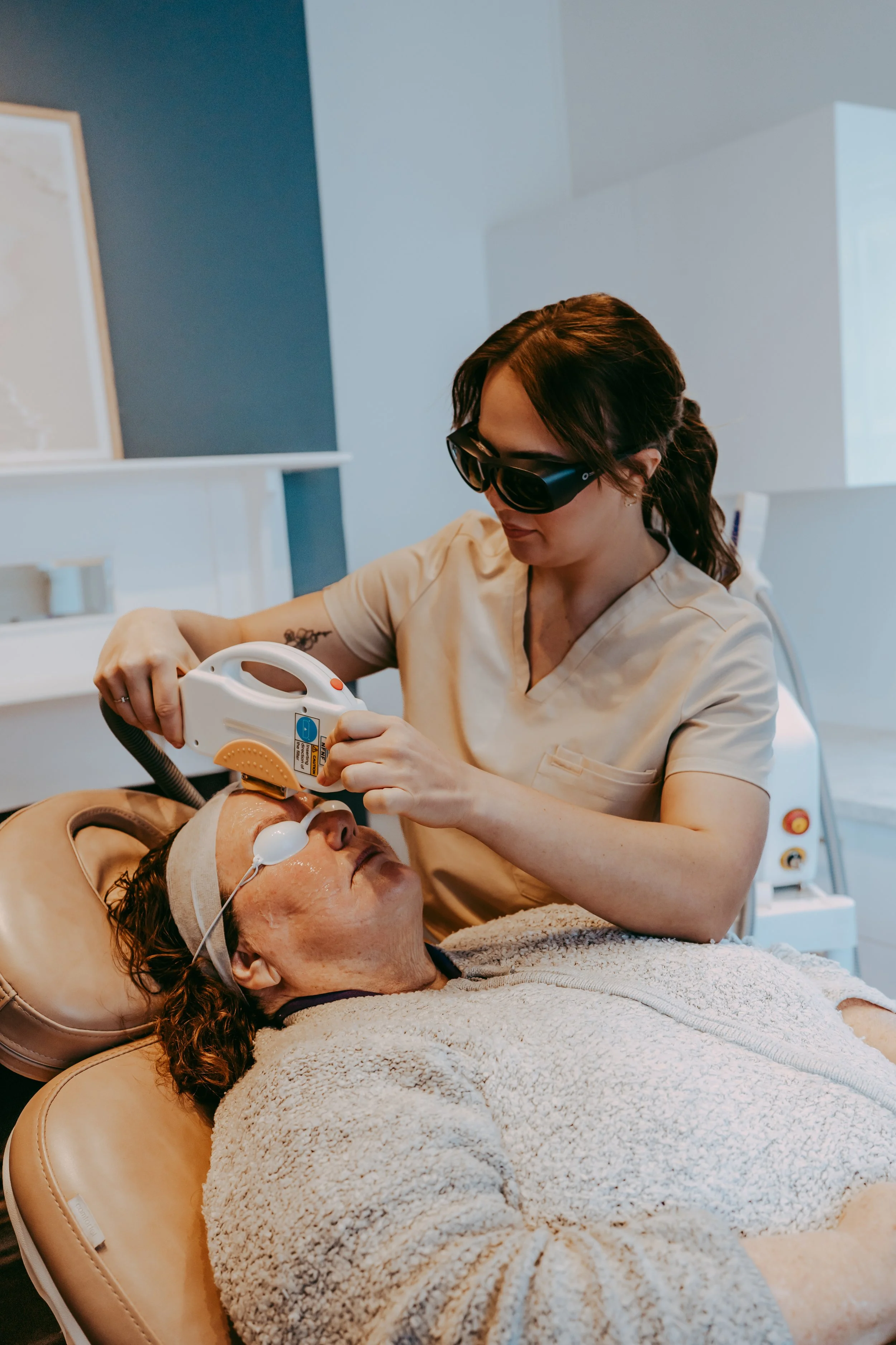IPL (Intense Pulsed Light) is used to target pigmentation, sun damage, vascular lesions and active acne. It works by delivering pulses of light into the skin to break down unwanted pigment or stimulate healing. A test patch is required 24–48 hours before treatment. A consultation is essential to confirm suitability.
